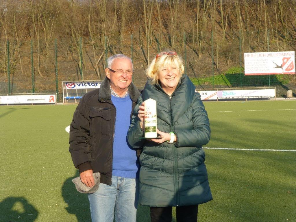 In der Halbzeitpause wollen wir etwas nachholen: Unsere AUFSTIEGSKERZE wird von Mechthild und Gerd Kießmehl entzündet. Unser Ehrenmitglied und seine Frau hatten diese Kerze mit der Aufschrift