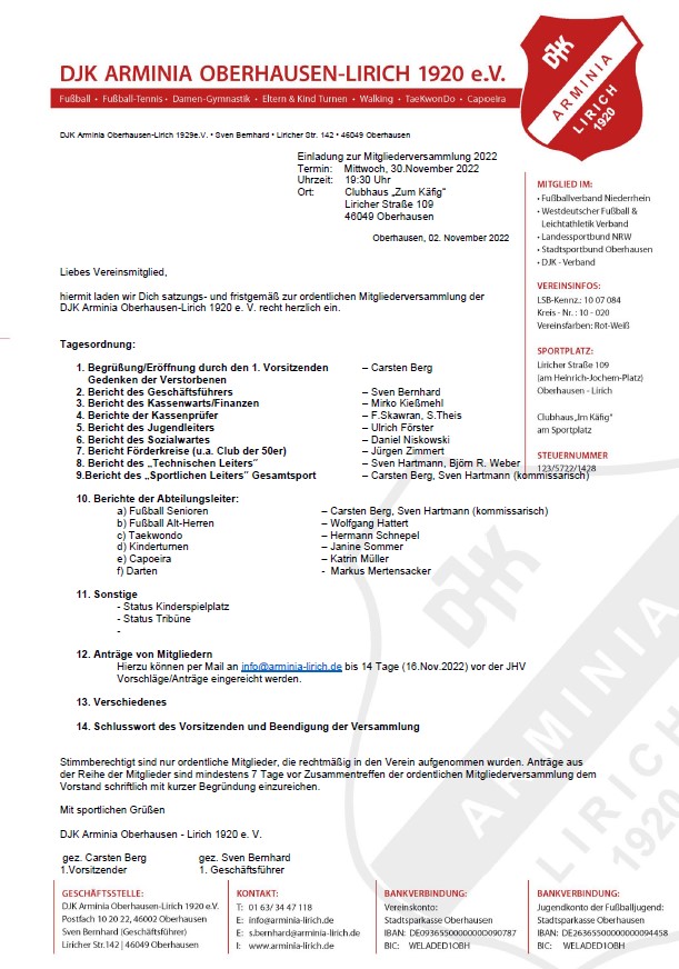 DJK Arminia Oberhausen-Lirich 1920 e.V.Sven Bernhard (Geschäftsführer)Liricher Str.14246049 Oberhausen